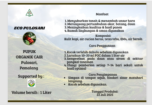Produk POC yang dikembangkan mahasiswa KKNT 132 telah diracik sebagai inovasi baru di bidang pertanian berkelanjutan. Meski memiliki manfaat tinggi, produk tersebut masih belum dapat untuk dipasarkan dan tidak memiliki ciri khas visual yang dapat memperkuat daya tarik konsumen. Menyadari hal itu, salah satu mahasiswa KKNT 132 mengambil inisiatif untuk merancang logo dan label kemasan yang sederhana, informatif, dan mudah dikenali.