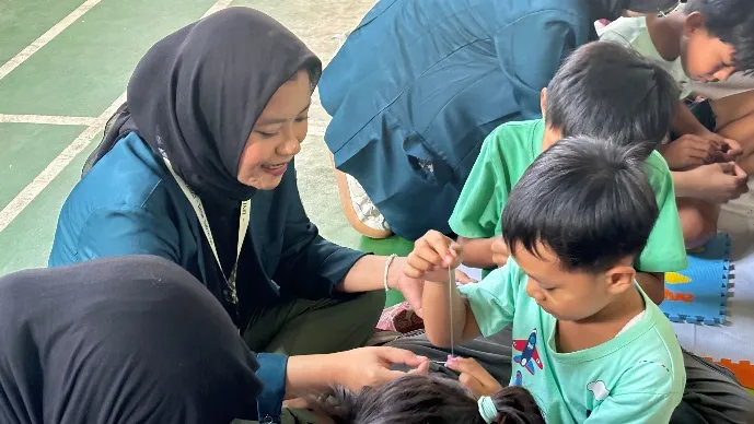 Kemudian, kegiatan dilanjut dengan sesi praktik pembuatan gelang dari manik-manik. Anak-anak diberi alat dan bahan, serta didampingi langsung oleh mahasiswa selama proses meronce.