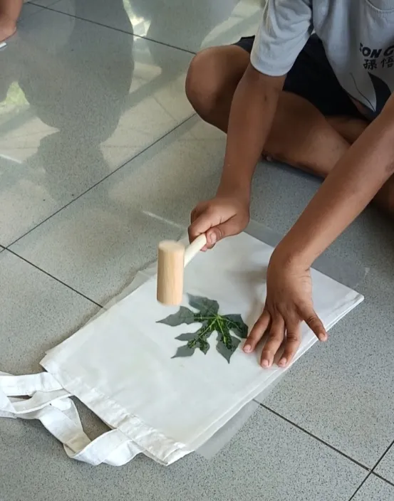 - Praktik Langsung: Anak-anak diberikan tas, alat pukul, dan daun yang sudah dikumpulkan sebelumnya di sekitar lingkungan, kemudian mencetaknya pada tas kain menggunakan teknik pukul (pounding).