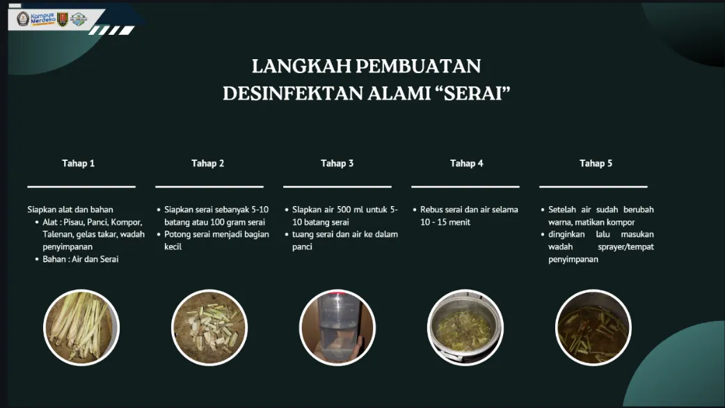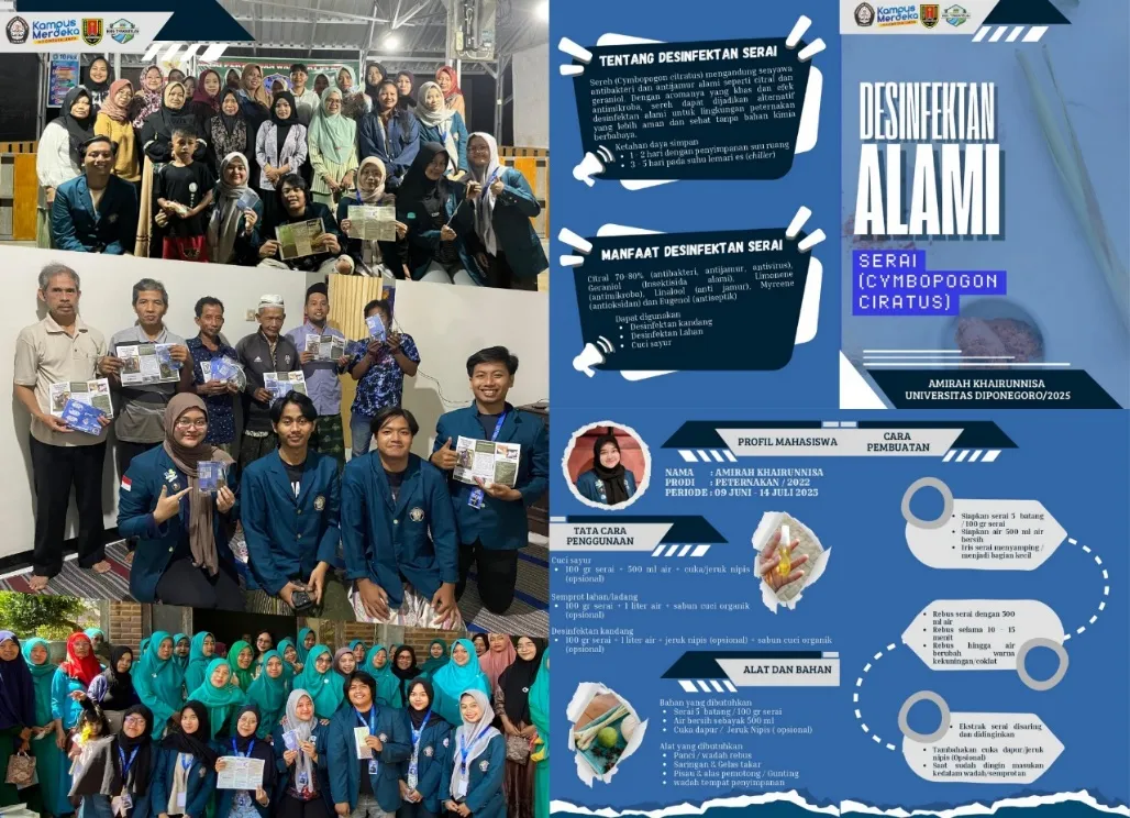 Program ini bertajuk “Pemanfaatan Serai Lokal: Solusi Desinfektan Ramah Lingkungan,” bertujuan untuk memperkenalkan inovasi pemanfaatan serai sebagai desinfektan alami yang aman dan mudah dibuat oleh kelompok ternak tani, Ibu PKK dan masyarakat sekitar. Pelaksanaan kegiatan berlangsung di Dusun Sironjang Dusun Dukuh, kelurahan Pakintelan, Kecamatan Gunungpati, Semarang selama 3 hari yaitu 29 Juni, 02 Juli dan 04 Juli 2025.
