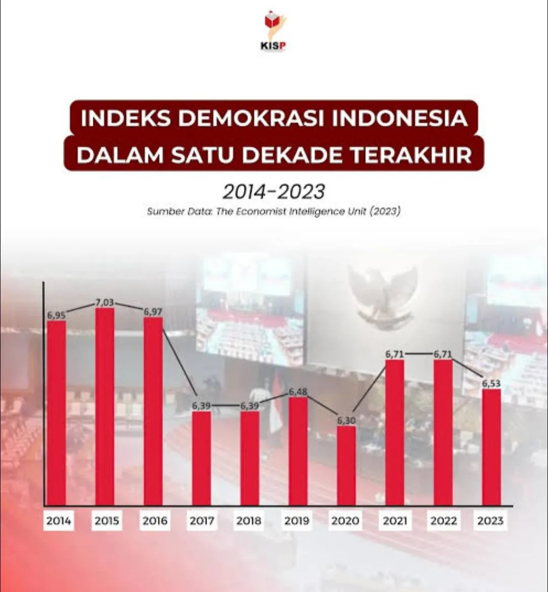 Salah satu indikator yang menggambarkan kemunduran demokrasi di Indonesia dapat dilihat dari laporan The Economist Intelligence Unit (EIU) dalam Democracy Index 2023, di mana Indonesia hanya mendapatkan skor 6,53 dan dikategorikan sebagai “flawed democracy” atau demokrasi cacat. Ini mencerminkan bahwa meskipun pemilu berjalan secara prosedural, kualitas institusi, akuntabilitas pemerintahan, partisipasi publik, dan perlindungan terhadap hak-hak sipil masih lemah. Di tingkat nasional, Lembaga Survei Indonesia (LSI) mencatat bahwa hanya 58,3% masyarakat merasa puas terhadap jalannya demokrasi pada tahun 2023, menurun dari 6,71% pada tahun 2021 sampai 2022.